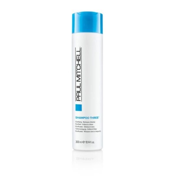 Shampoo Three 300ml from Paul Mitchell is a clarifying shampoo that deeply cleans and removes residue from chlorine, salt, iron, and minerals. It’s ideal for swimmers and helps to avoid a green tint that may be caused by chlorine. It strengthens the hair and minimizes the formation of deposits.
